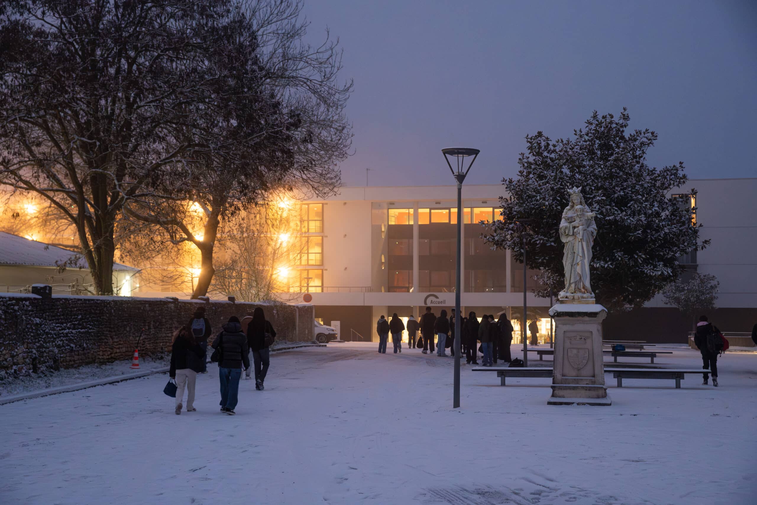 Ce matin, la neige a recouvert l’ensemble scolaire Isaac de l’Étoile, offrant un paysage aussi rare que magnifique. Les cours, les bâtiments et les espaces extérieurs se sont transformés en un décor hivernal apaisant, suscitant l’émerveillement des élèves comme des équipes.