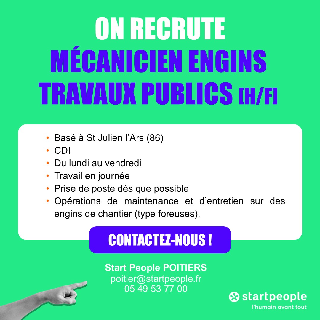 Mécanicien engins TP (H/F) à St Julien l’Ars (86) Date de publication : 7 octobre 2025 Nom de l'entreprise : START PEOPLE Tél : Email : Site Internet : Présentation du poste Accéder à l'annonce ici Imprimer l'offre Retour aux offres d'emploi